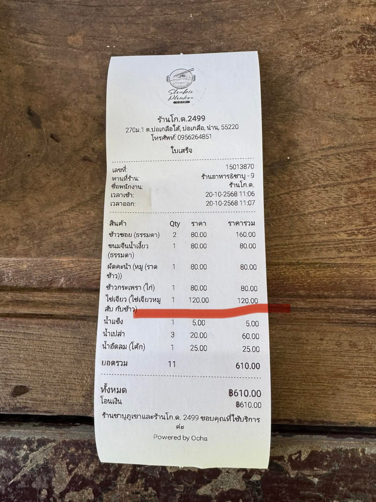 เมื่อวันที่ 20 ตุลาคม 2568 เวลา 11.07 น. ทุกอย่างเหมือนจะปกติ และตอนแรกก็ไม่คิดอะไร เพราะว่าเข้าไปกินหลายคน ตอนกินเสร็จ และน้องอีกคนหนึ่งเป็นคนสำรองจ่ายไปก่อน และผมจ่ายตังค์ทีหลัง จึงสังเกตว่าผมสั่งข้าวผัดกะเพราไก่ 1 จาน ราดด้วยไข่เจียวหมูสับ ทุกอย่างเหมือนจะปกติ แต่ที่ไม่ปกติคือ ราคากระเพราไก่ ราคา 80 บาท ราคาไข่เจียว คุณคิดเป็นกับข้าวในราคา 120 บาทแต่สิ่งที่ผมได้ไข่เจียวมานั่นคือเอาไข่เจียวมาราดกับกะเพราไก่ที่สั่ง แบบนี้คือ คนกินผิด หรือว่าไม่ยอมชีแจง ว่าถ้าสั่งแบบนี้จะคิดเป็นกับข้าว ถ้าแยกเป็นกับข้าวต้องแยกมาชิว่ะ!! เงิน 120 บาท ไม่ได้คิดเยอะหรือว่าเสียดาย แต่ที่เสียดายคือคุณไม่ยอมชี้แจงลูกค้าตั้งแต่ตอนแรก” นั้น