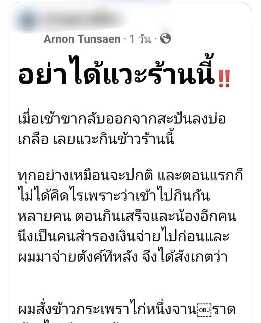 เมื่อวันที่ 20 ตุลาคม 2568 เวลา 11.07 น. ทุกอย่างเหมือนจะปกติ และตอนแรกก็ไม่คิดอะไร เพราะว่าเข้าไปกินหลายคน ตอนกินเสร็จ และน้องอีกคนหนึ่งเป็นคนสำรองจ่ายไปก่อน และผมจ่ายตังค์ทีหลัง จึงสังเกตว่าผมสั่งข้าวผัดกะเพราไก่ 1 จาน ราดด้วยไข่เจียวหมูสับ ทุกอย่างเหมือนจะปกติ แต่ที่ไม่ปกติคือ ราคากระเพราไก่ ราคา 80 บาท ราคาไข่เจียว คุณคิดเป็นกับข้าวในราคา 120 บาทแต่สิ่งที่ผมได้ไข่เจียวมานั่นคือเอาไข่เจียวมาราดกับกะเพราไก่ที่สั่ง แบบนี้คือ คนกินผิด หรือว่าไม่ยอมชีแจง ว่าถ้าสั่งแบบนี้จะคิดเป็นกับข้าว ถ้าแยกเป็นกับข้าวต้องแยกมาชิว่ะ!! เงิน 120 บาท ไม่ได้คิดเยอะหรือว่าเสียดาย แต่ที่เสียดายคือคุณไม่ยอมชี้แจงลูกค้าตั้งแต่ตอนแรก” นั้น