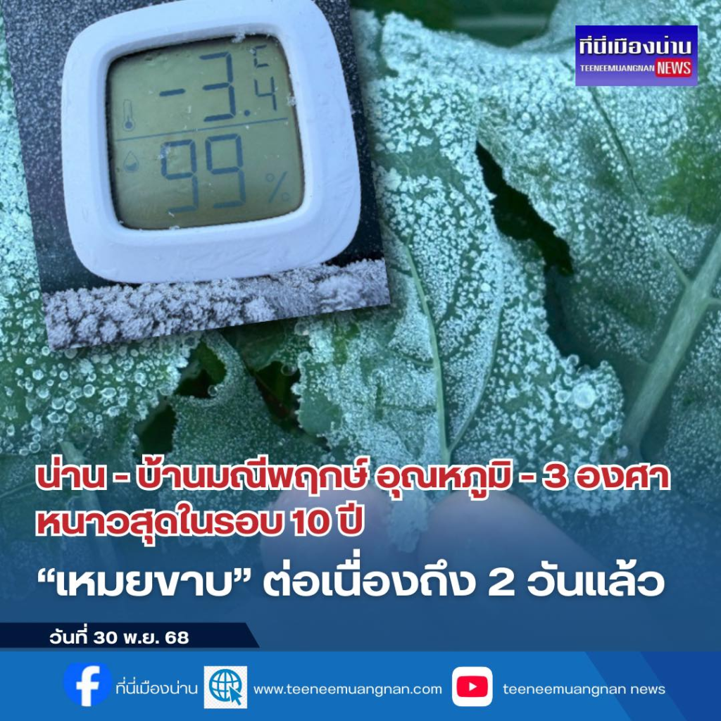 วันที่ 30 พฤศจิกายน 2568 ผู้สื่อข่าวรายงานว่า ที่บ้านมณีพฤกษ์ ตำบลงอบ อำเภอทุ่งช้าง จังหวัดน่าน ชาวบ้านยังคงพบปรากฏการณ์ “เหมยขาบ” หรือ น้ำค้างแข็ง ปกคลุมยอดหญ้า ใบไม้ และหลังคาบ้านอย่างหนาแน่น ต่อเนื่องเป็นวันที่สอง หลังอุณหภูมิลดต่ำสุดเหลือ -3 องศาเซลเซียส นับเป็นค่าต่ำสุดในรอบ 10 ปี ของพื้นที่สูงแห่งนี้
