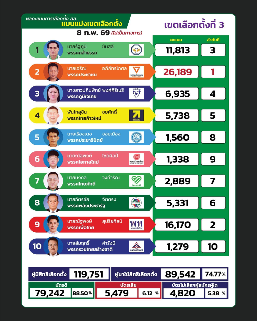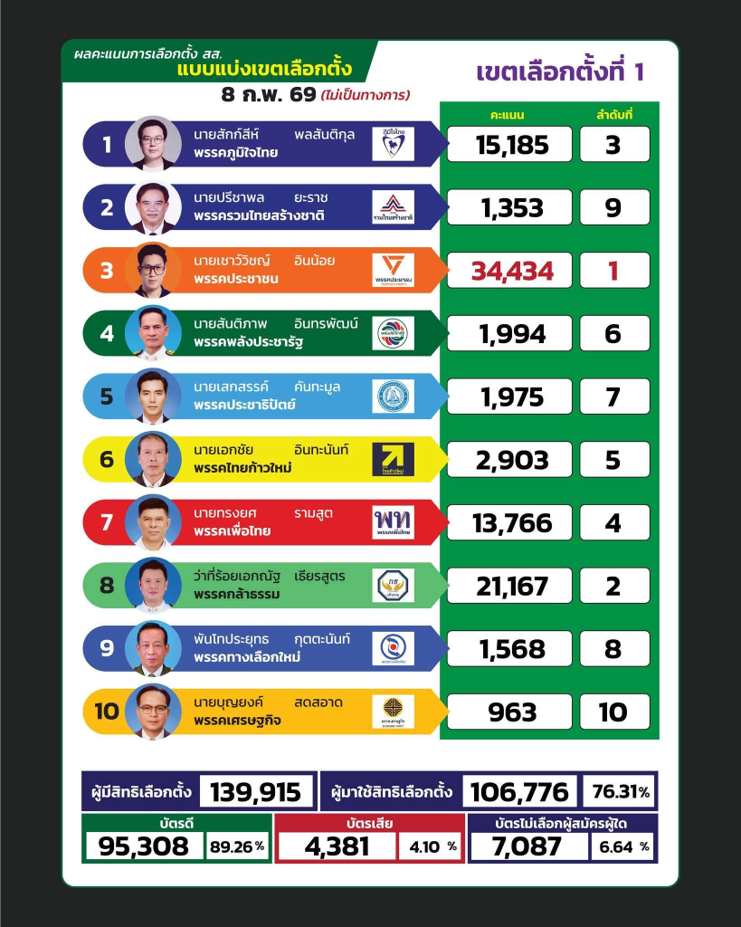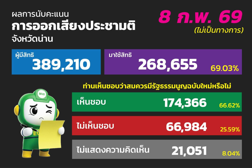 ข่าว ผลการนับคะแนน การเลือกตั้ง สส. จังหวัดน่าน แบบแบ่งเขตเลือกตั้ง 8 กุมภาพันธ์ 2569 โดย AdminOIT - 9 กุมภาพันธ์ 2026 0 5 แชร์เรื่องนี้ ผลการนับคะแนน การเลือกตั้ง สส. จังหวัดน่าน แบบแบ่งเขตเลือกตั้ง 8 กุมภาพันธ์ 2569 อย่างไม่เป็นทางการ แชร์เรื่องนี้