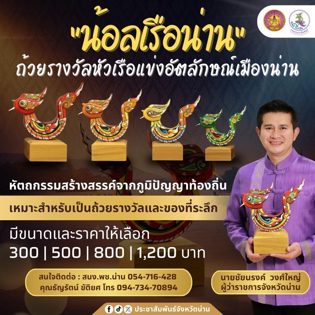 ผู้ว่าฯ น่าน เชิญชวนใช้สินค้าหัตถกรรมสร้างสรรค์จากภูมิปัญญาท้องถิ่น ถ้วยรางวัลหัวเรือแข่งอัตลักษณ์เมืองน่าน