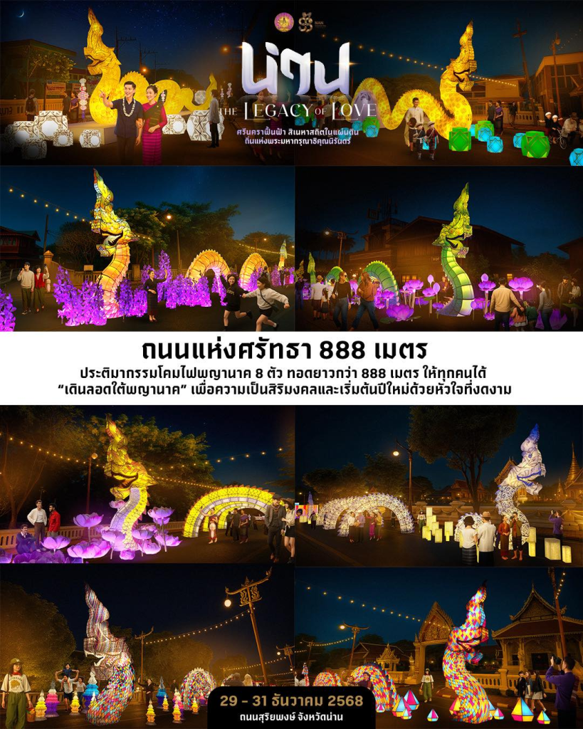 การจัด #งานสืบสานประเพณี#วัฒนธรรม และ #เทิดพระเกียรติ สมเด็จพระนางเจ้าสิริกิติ์ พระบรมราชินีนาถ พระบรมราชชนนีพันปีหลวง – The Legacy of Love ในครั้งนี้ ถูกจัดขึ้นบนถนนสุริยพงษ์ ที่ถูกรังสรรค์ขึ้นมาใหม่จนกลายเป็นถนนแห่งศรัทธาที่มีความยาวถึง 888 เมตร ตลอดทั้งสายประกอบไปด้วยประติมากรรม 8 น่านนาคา ที่คอยปกปักรักษา และอวยพรทุกหัวใจที่ได้มาเยี่ยมชมงาน เพียงแค่เดินลอดใต้ผ่านคุณก็จะสัมผัสถึงพลังศรัทธาที่แท้จริง